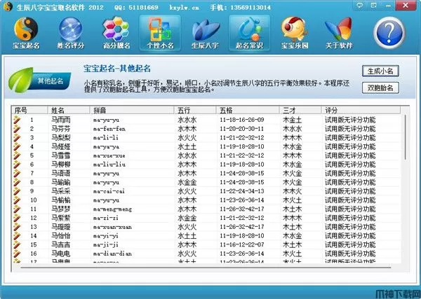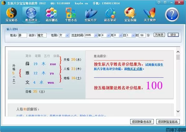 5、生辰八字五行宝宝起名软件还拥有强大的名字评分功能,不但可以用五格数理对姓名评分,还可以按生辰八字为姓名评分。