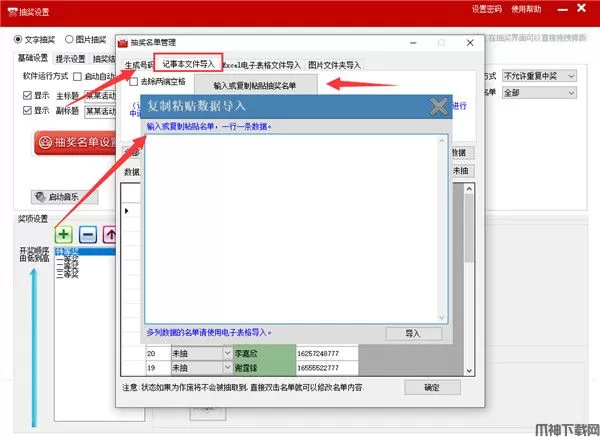 单击抽奖名单设置选择存抽奖名单的记事本导入,将记事本数据复制粘贴到输入框中即可。