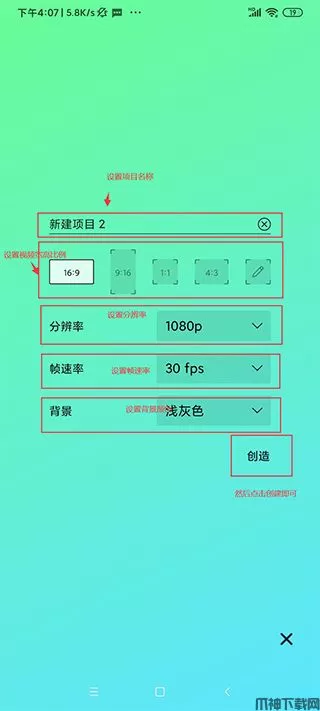 2、、可以设置项目名称、宽高比例、分辨率、帧速率、背景颜色;