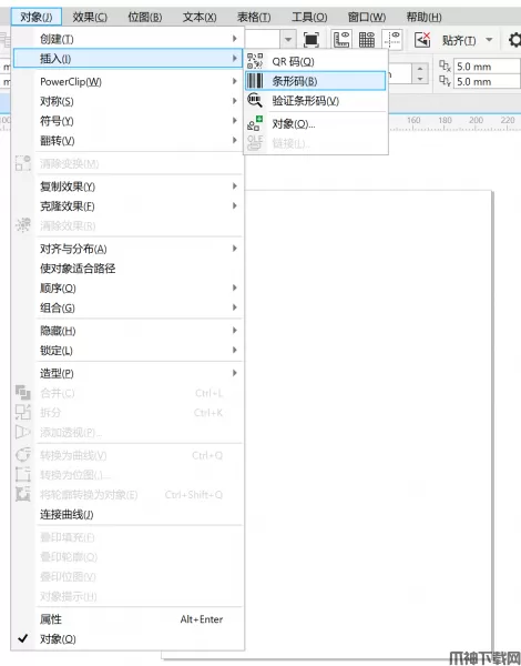 1、找到条码工具。在上方菜单栏点击【对象】-【插入】,第二项就是【条形码】。选择后会自动打开条码向导窗口。
