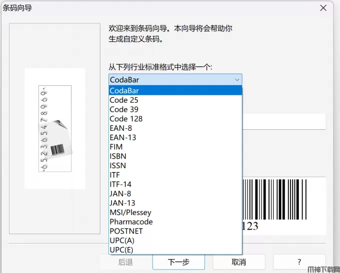 2、选择条码格式。在条码向导中,可以看到软件内置的多种条码类型,适用于不同行业和场景。比如Codabar(库德巴条码),它是一种广泛应用在物流、图书馆和血库系统的条码格式,支持数字0-9以及部分符号,一般长度在4到16位之间。我们可以根据项目需要选择合适的类型,然后在下方输入相应的数据内容,点击【下一步】。