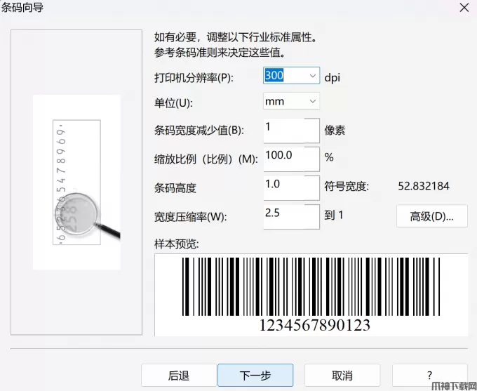 3、设置打印信息。在接下来的窗口中,可以设置打印机分辨率等信息。这样做能让条形码在打印和扫描时更加准确。