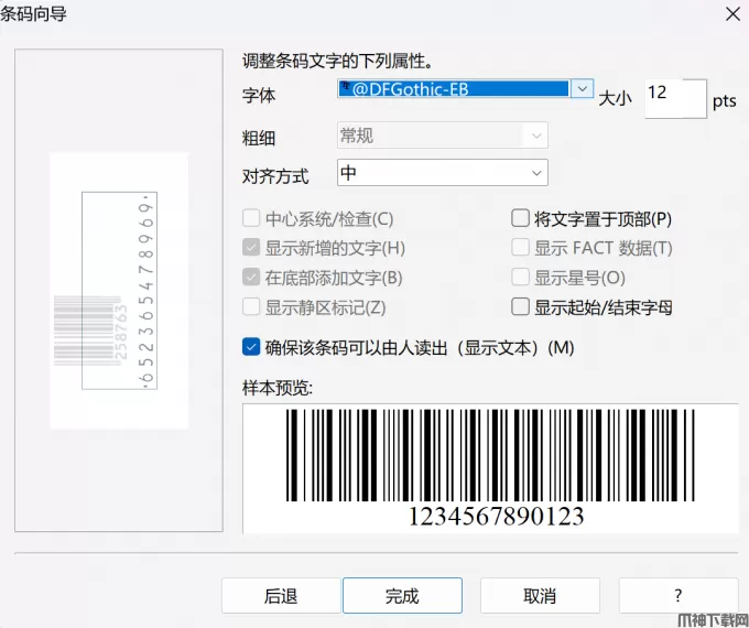 4、调整条码字体。继续点击【下一步】,会进入字体设置环节。这里可以修改条码下方文字的字体样式和大小,让它和整体设计保持统一。
