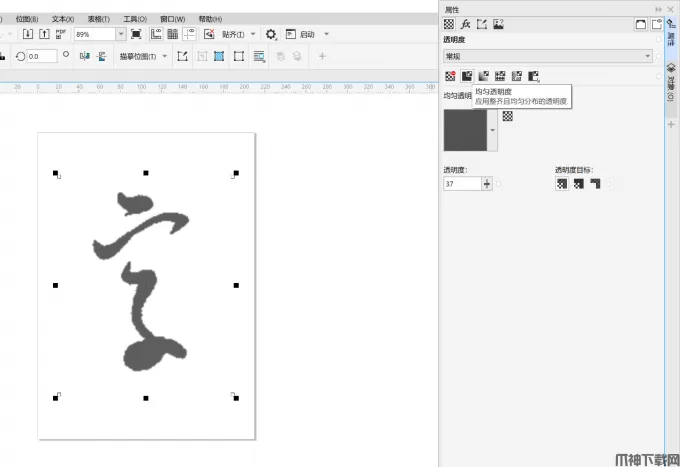 2、调整透明度。选中参考字,在属性窗口中找到【均匀透明度】,适当降低透明度。这样做的好处是能让字帖看起来更浅,方便在上方进行描摹而不会混淆。