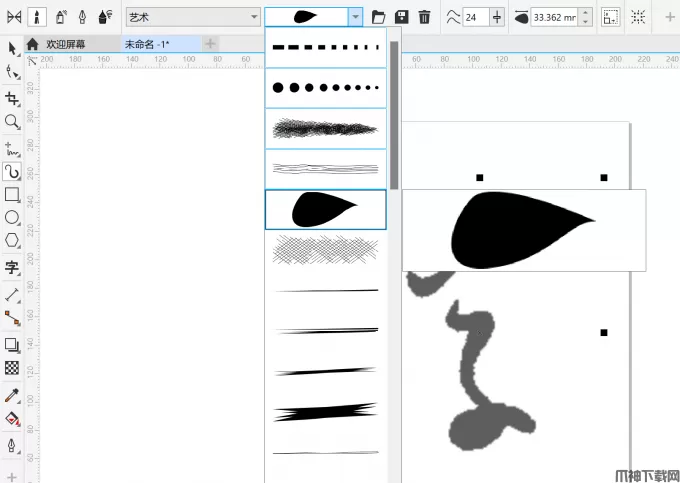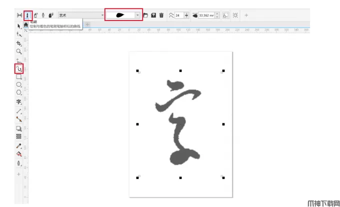 3、选择艺术笔刷。在左侧工具栏中点击【艺术笔】,在上方的笔刷选项中挑选合适的笔刷,CDR自带多种笔触效果,这里推荐使用带有墨点质感的笔刷,能更好地模拟书法笔墨的浓淡变化。