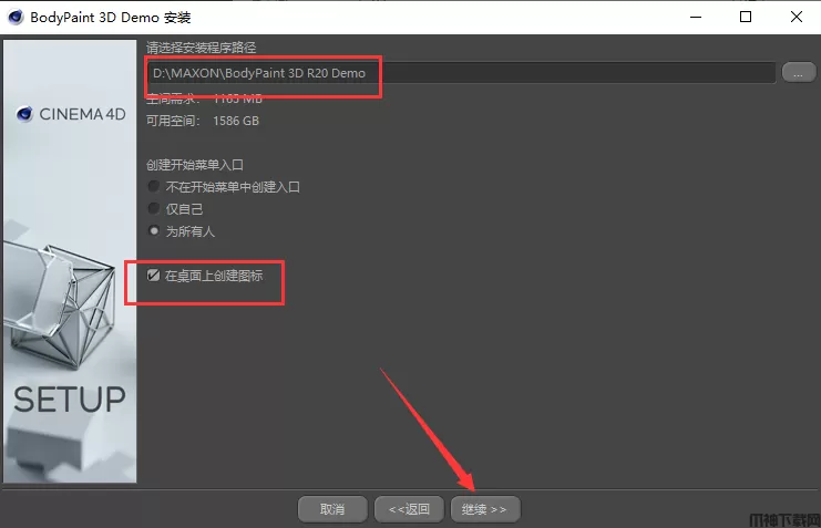 6、更改安装位置,勾选【在桌面上创建图标】的选项,点击继续。