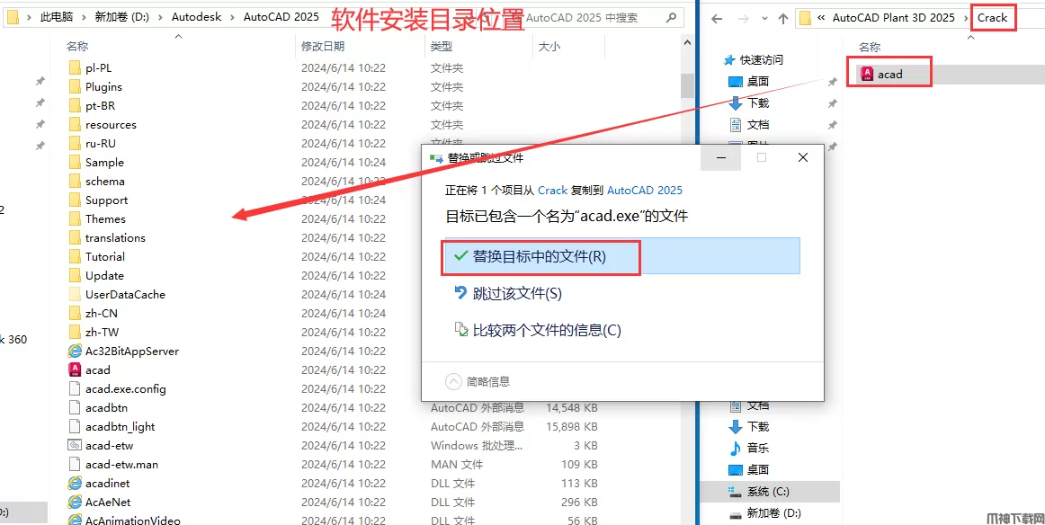 9、将Crack文件夹里面的激活补丁复制到刚才打开的软件安装目录下粘贴,弹出替换对话框,点击替换目标中的文件即可。