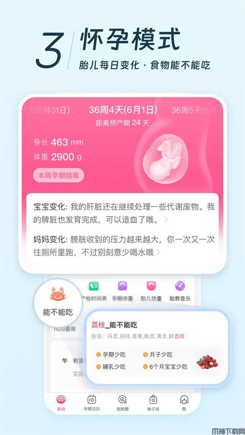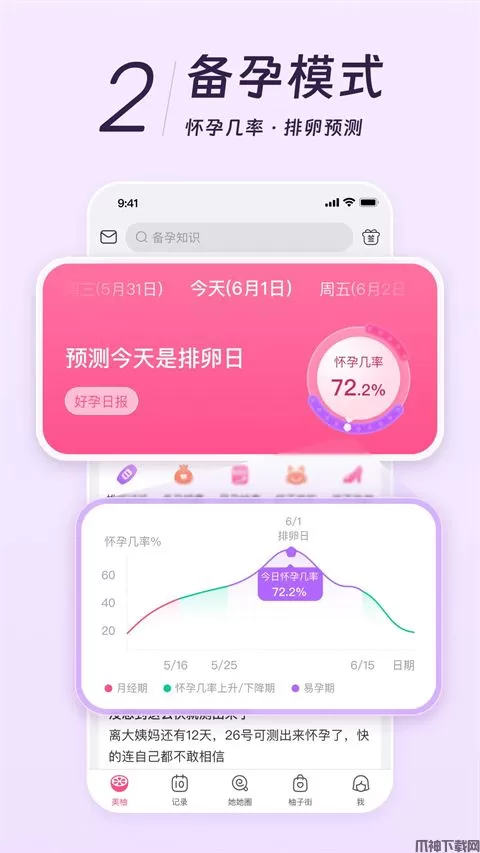 开启经期、备孕、怀孕、育儿四大模式,陪伴你从校服到婚纱,从少女到妈妈,不同时期给你特殊的照顾。