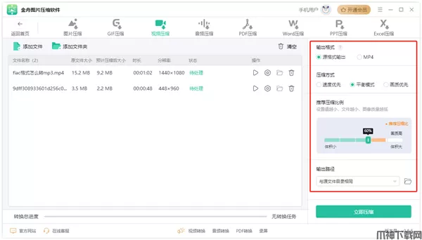 视频压缩方式主要分为速度优先、平衡模式和画质优先,根据自己的需要选择即可。同时压缩比例可以自由调整,数值越小,文件就越小,且图像质量也会较低;同时支持原格式输出或将视频转为mp4格式。