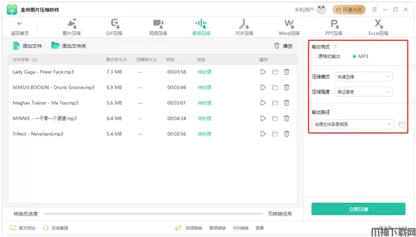 支持压缩mp3,wav,ogg,flac,mp2,m4a,m4r等格式音频,一键选择压缩电脑音乐、有效的节省电脑空间;导出格式可以选择原格式压缩,也可以统一转成mp3格式。