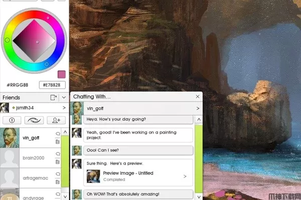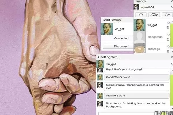 通过 PaintLink 信息服务直接向好友发送 ArtRage 工具、参考图片、颜色集和其他内容,并将收到的内容直接融入绘画中。