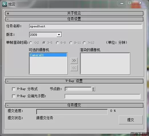 4、运行3dsMax软件,例如Max 2009。在"文件"菜单中打开渲染设置对话框,设置渲染结果保存路径,然后,在“渲染”菜单=> “炫云”菜单项,出现如下图所示的“炫云”对话框,单击“提交”按钮即可。