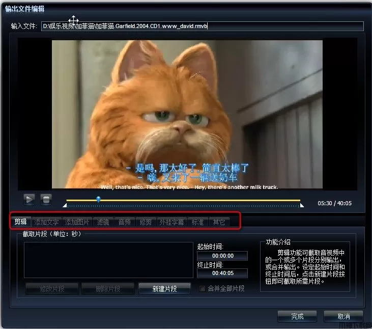 视频剪辑功能,简单的操作就可把一部影片剪辑成多个短片,分别输出或重新合并。