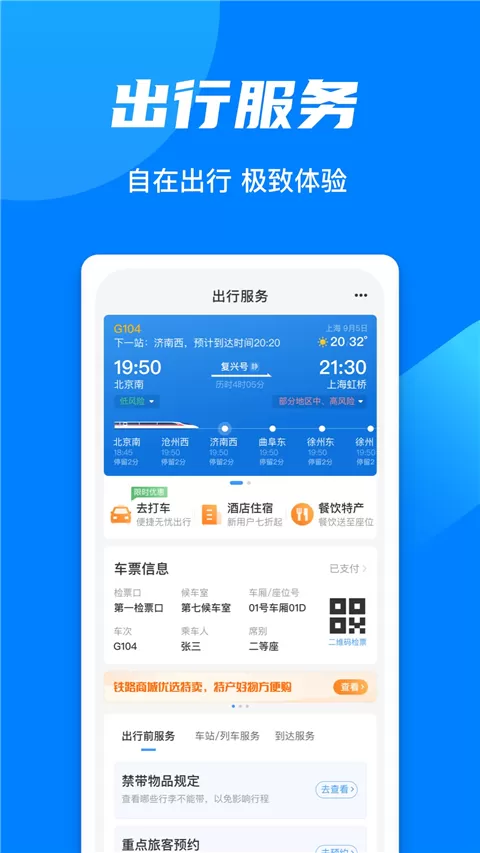 提供高铁订餐、酒店预订、约车接送站、铁路游、景区门票预订、铁路商城、出行保险等服务,吃住行游购娱,一款APP满足您的出行需求。