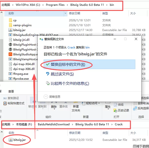 5、找到软件安装位置,默认位置为【C:\Program Files\Bitwig Studio 6.0 Beta 11\bin】,把Crack补丁复制安装目录当中替换;