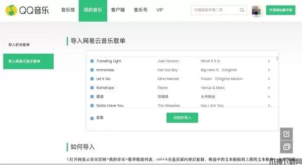 6、第六步,点击识别并导入,即可将网易或者虾米的歌单导入到QQ音乐。