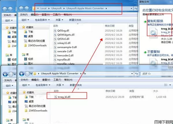 4、将trreg_bl.dll复制到安装目录中,点击替换目标中的文件,默认路径CF:\Users\用户名\AppData\Local\Ukeysoft\Ukeysoft Apple Music Converter。