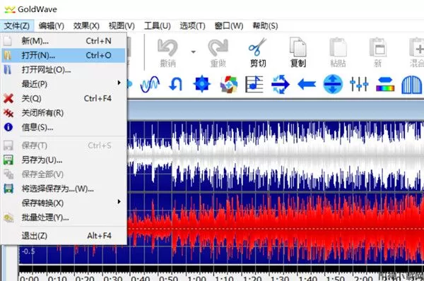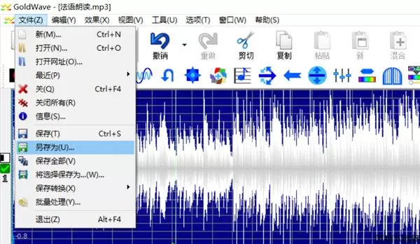 首先,我们进入GoldWave的主界面,双击“打开”键,找到需要提取的视频文件,不做任何操作,直接点击左上角的“另存为”,点击“mp3”格式即可。