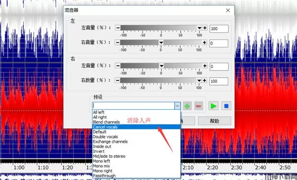 在混音器的窗口中选择预设情形,这里我们需要消除人声,所以就选择“Cancel vocals”,中文就是消除人声的意思。然后点击”OK“按钮即可。