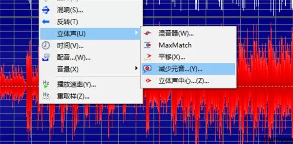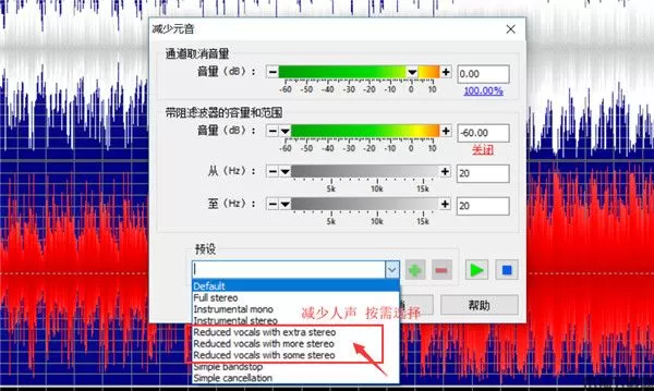这里还有一种方式,就是在第二步中,在“立体声”中选择“减少元音“。这里大家可能不明白什么是“元音”,“元音”其实就是音乐中有一个歌手表现的部分,说白了就是人声部分。