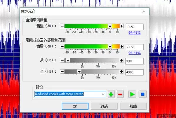 这里我根据需要选择了“Reduce vocals with more stereo”,也就是减少更多立体元音,选择之后,上面的所以参数都会自动调整至预设设定的值,然后我们点击”OK“按钮即可。