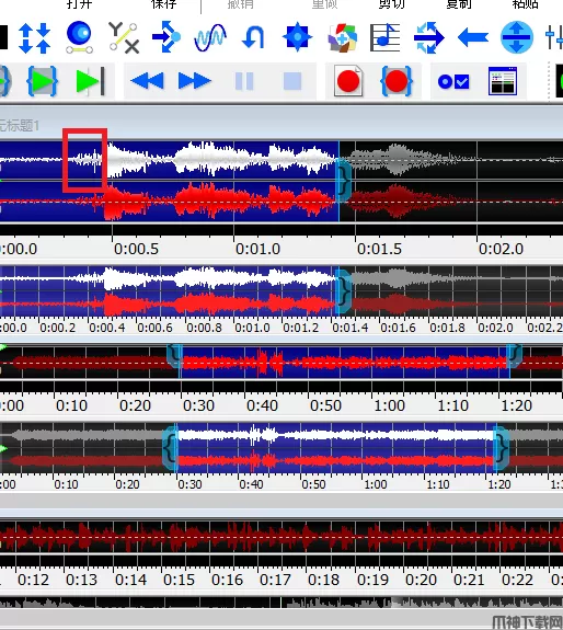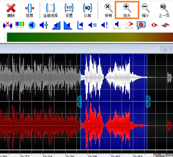 我们先在GoldWave中找到需要保留的部分,大概在哪个位置,然后点击上方的“剪刀”,把这一段截取下来。这里有一个小细节,如果你需要的那段音频非常短,可以点击GoldWave主页面上方的“放大”键,放大波形哦!截取音频之后,点击上方的“剪切”。