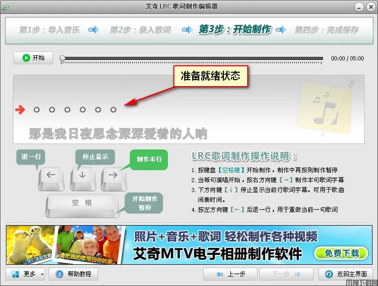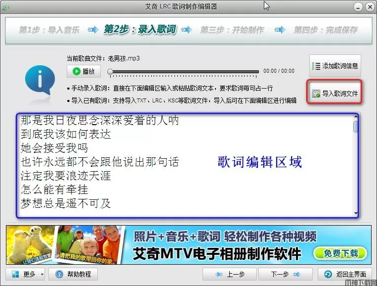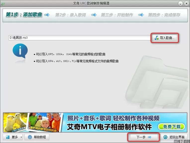 导入好歌曲文件后,点击“下一步”按钮进入录入歌词的步骤。