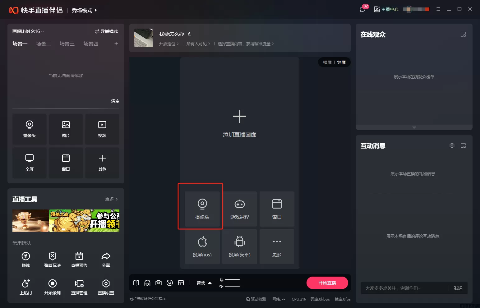 步骤2:打开快手直播伴侣,点击【添加素材】→选择【摄像头】→设备列表选择“YY开播”→“打开该摄像头”(若未识别,重启软件或更新版本)。