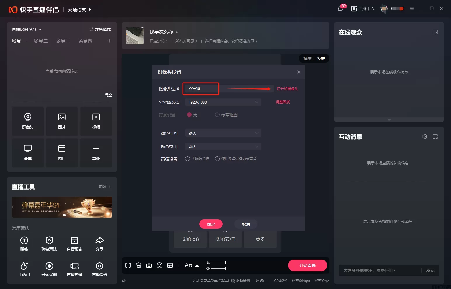 • 如果摄像头画面不正常,可以尝试在快手伴侣上删除【YY开播】摄像头,再重新添加。