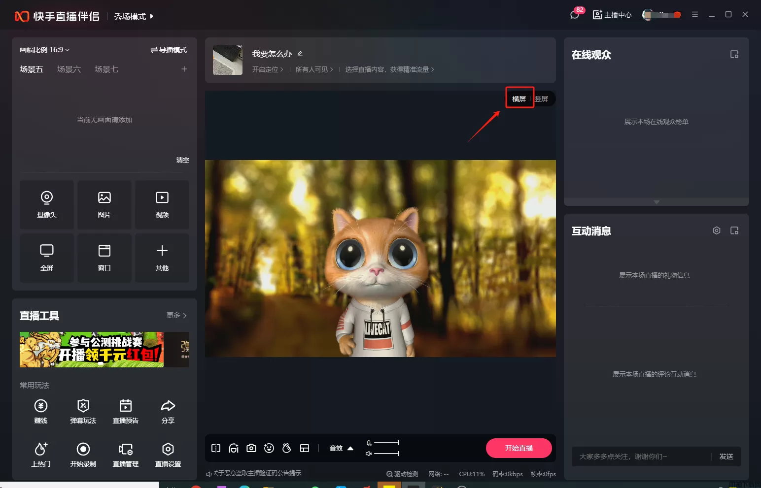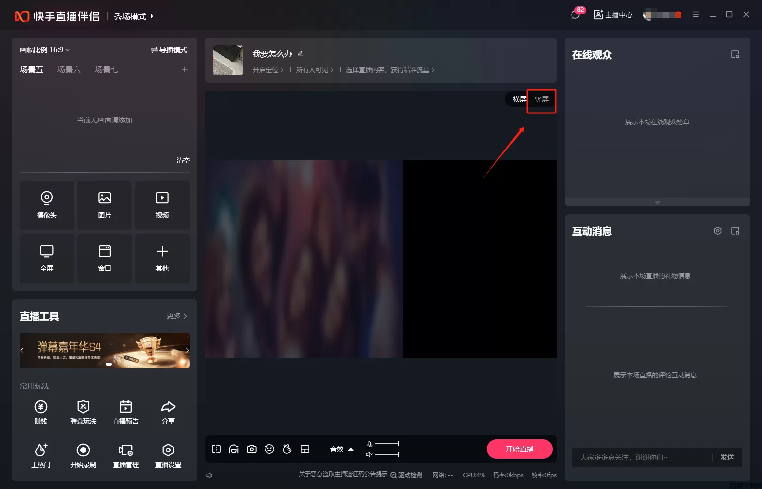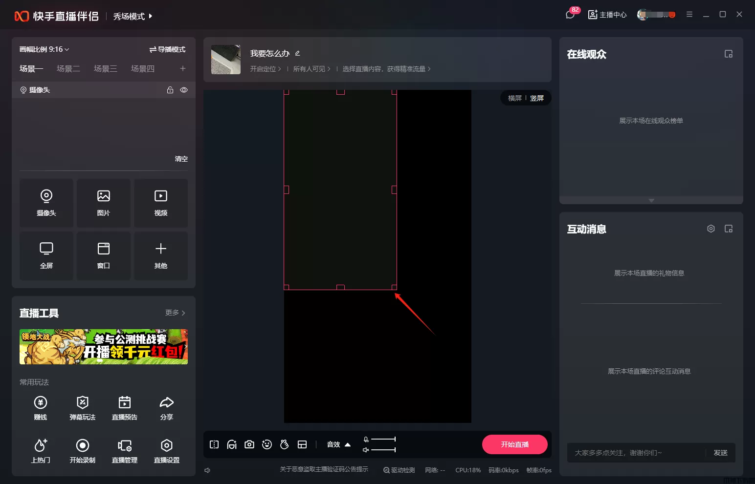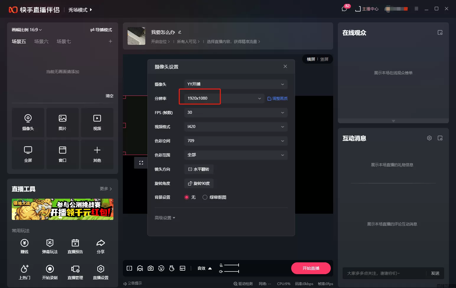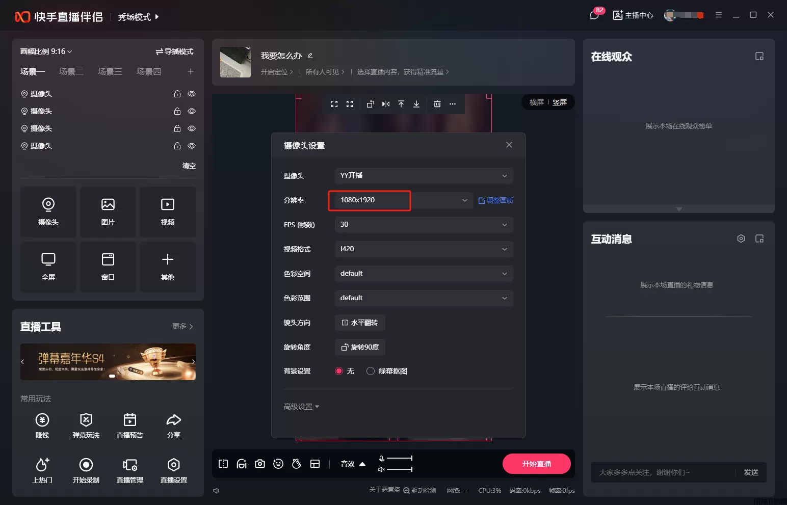 • 点击快手直播伴侣右上角【竖屏模板】→右键画面选择【属性】或者双击摄像头画面→将分辨率调整为1080×1920。