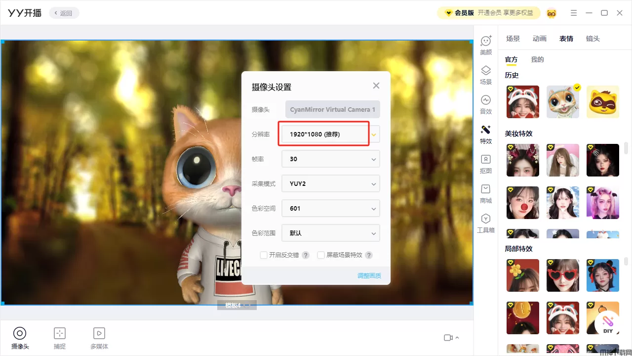 步骤1:启动YY开播,点击【打开摄像头】→选择真实摄像头→确认设备参数(默认横屏分辨率1920×1080)。