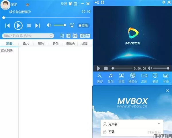 视频窗口既可以用来显示用户选择的背景图片、视频,还可以选择模式播放MTV、电影;既可以播放本地的视频文件。也可以在线播放网络视频资源;不仅能实现视频、图片、摄像头取景以及合成效果,同时还可以添加大头贴特效,实现虚拟视频、画中画、摄像头抠像、文字滚动字幕、视频捕捉等多种视频特效,进行多个视频特效的叠加;另外在用户播放歌曲时还会有歌词字幕同步流动出现在视频窗口下方,新颖独特;并支持视频窗口拖动大小显示和全屏显示。同时MVBOX还提供自己的音视频解码器包,可以播放任何格式的音视频文件格式。