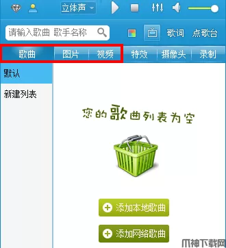 主界面的歌曲、视频、图片标签是你的虚拟视频添加选项。你如果想唱歌,那你就在歌曲标签中添加歌曲并播放,你就可以K歌了。