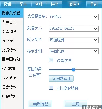 通过对滤镜效果的调节,可以使视频画面呈现旋转、灰度、X光、X光叠加、多人电视墙等效果,尤其是X光叠加效果更可以使您只需替换背景画面,就可以出现于任何场景内唱歌跳舞,轻松的实现人在前背景在后的亦真亦幻的效果。