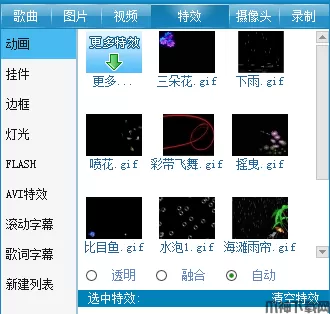 点歌台特效下载为您提供了海量特效素材资源,多个特效的叠加,让使用者的视频更加出色,同时支持JPG、GIF、FLASH、AVI等流行格式。