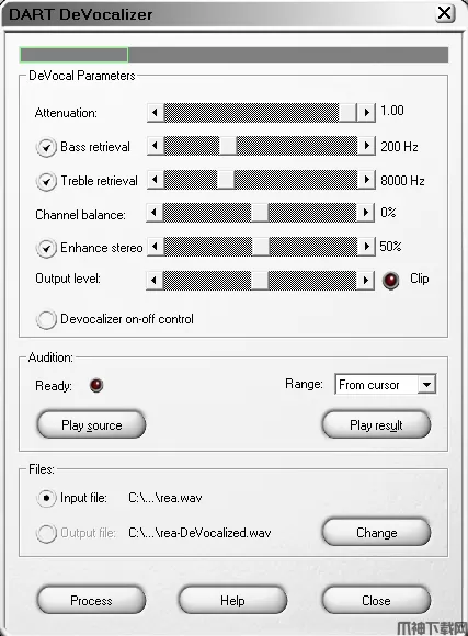 现在回到dart karaoke studio中文版窗口,我们来把录制的歌曲中的人声去除。点击“Open Soundtrack”图标,在文件选择窗口里打开刚才抓下的文件Track06.wav,点击“DeVocalizer”图标,在DeVocalizer窗口)里有3个参数,它们是指:Attenuation——使声音变薄,参数越大演唱声消除得越明显,但伴奏声音也会变得很飘,所以你通过调整它来找到一个合适的位置;Bass retrieval——声音变薄后音乐的低音会被衰减得很厉害,所以你可以通过这个参数来恢复任意频段的低音;Output——输出电平调节,旁边的灯是过载显示,应该尽量不要使过载灯常亮。Play Source和Play Result也是试听按钮,Change可以设置处理后的文件存放位置,调整满意后点击Process进行处理,完成以后你就可以听到你希望已久的伴奏音乐了。这里要指出的是,DART Karaoke Author也支持直接打开MP3文件进行处理,不过效果就没有CD的好啦。