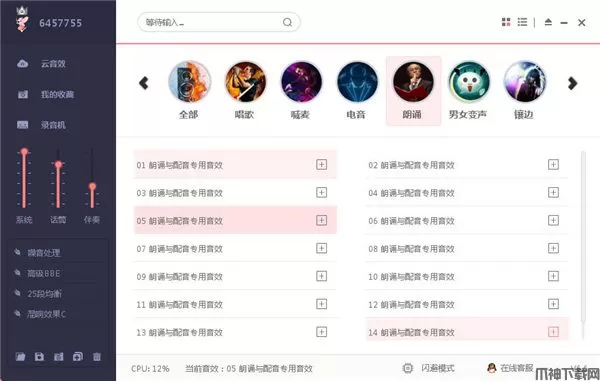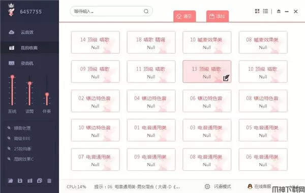 电音精灵免费版是一款支持众多网络语音聊天软件的电音调试软件,电音精灵是一款典型的VST机架软件,主要对于麦克风输出声音的处理,可以广泛应用与网络K歌,MC喊麦等。软件集成大量的VST插件,可以调试出千奇百怪的声音效果,如(电音 闪避 跟唱 爆麦 闷麦 留声机 哇音 变音 主持 跟踪 魔音 合唱 等等),由于它界面友好,操作方便的特点,受到了YY、聊聊、UC、IS、Qtalk 9158等用户的喜爱和支持。内置简易调音台,可调节系统音量,麦克风音量和播放器音乐音量。对于收藏列表里的机架模板项目,可设置键盘快捷键实时控制切换,可修改当前模板名称,也可以进入迷你模式进行加载模板。电音精灵严格遵循混音学中效果器处理顺序,分别是降噪,激励,均衡,混响,压缩,处理后的声音更清晰,更干净,更好听!