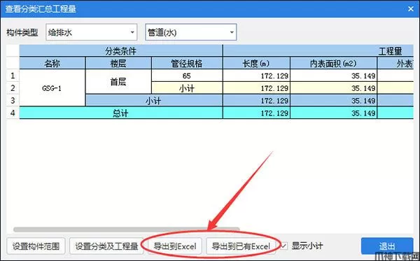绘图界面:点击【图元查量】左键在绘图区选择图元,下方会出现所选择图元的工程量,可以导出excel。图像分类工程量界面:在工程量界面点击【分类工程量】在弹出的窗口下方有导出excel。
