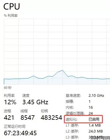 ① 虚拟化。任务栏上右键【任务管理器 - 性能 - cpu】里面看看虚拟化是否“已启用”状态。可能因为一些操作被关闭,如果未启用需要查找教程打开。