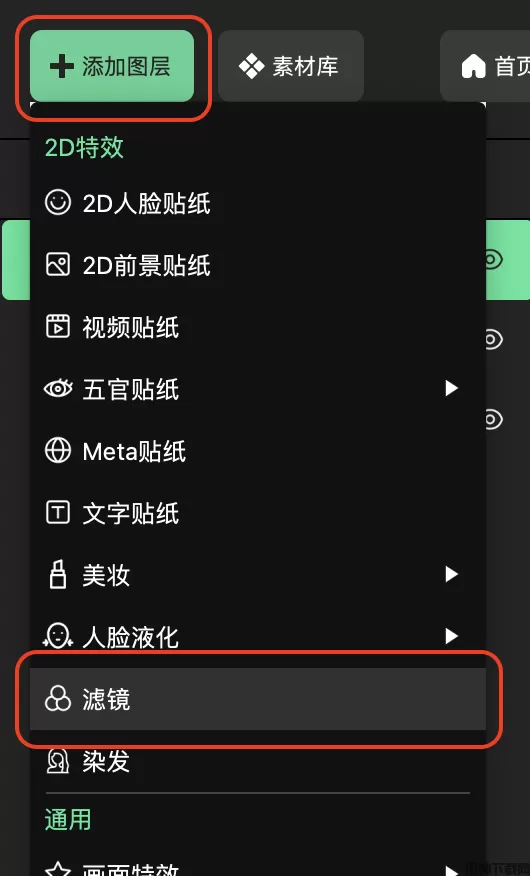 「添加图层」按钮,在下拉菜单中,选择2D特效-滤镜