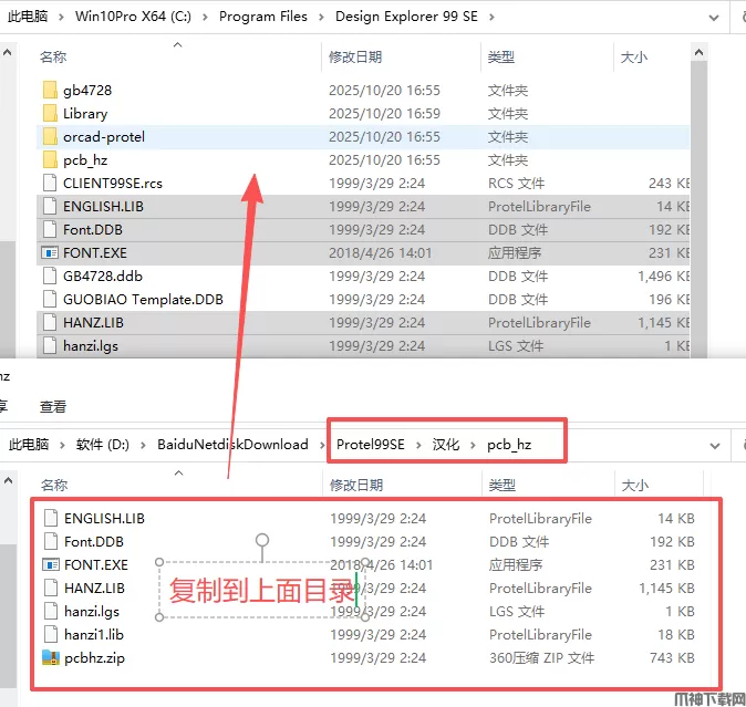 8、安装PCB汉字模板:回到安装包,打开“汉化”文件夹里面的“pcb_hz”文件夹,将文件夹内的所有文件复制粘贴到软件安装目录下(默认路径:C:\Program Files\Design Explorer 99 SE);注意查看hanzi.lgs和Font.DDB文件的属性,将“只读”选项去掉。