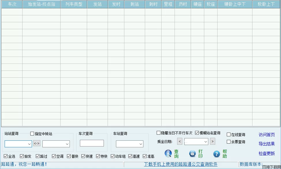 软件使用软件本身带的数据库,(不用gprs和短信)不需要网络支持,免费版本是全部数据,有站站查询、车次查询、车站查询等功能。