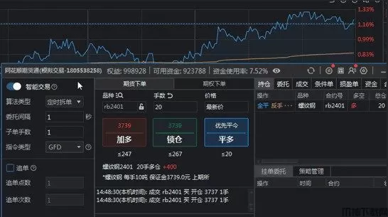 1、期货通智能交易更新,算法望为你保驾护航.算法拆单是指利用计算机程和数字模型来决定交易下单的时机、价格和数量的交易方法,通过将大单拆为小单。减少小市场冲击成本,藏隐藏自己的交易意图。期货通算法菜单还可以解锁一些特殊的算法模式,适合大单用户和专业投资者使用。
