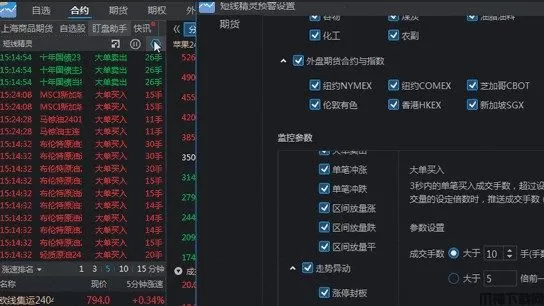 2、期货通盯盘助手在本次更新中也新增了短线精灵功能,可以显示国内各大期货交易所和外盘行情的短线大师(如大单,张庭,拉升等)提醒,点击右上角配置,还能具体根据交易所和期货品种类型分类,事件也可以具体到类型,方便短线投资者盯盘使用。