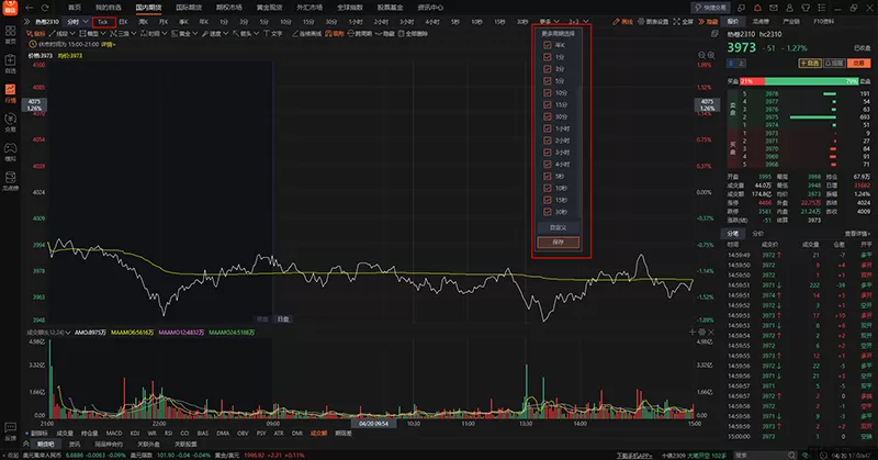 国内期货新增tick行情和秒级K线行情。您可在期货详情页的周期选项中点击“tick”按钮查看tick行情,点击“更多”按钮选择和查看5秒、10秒、15秒、30秒K线行情。