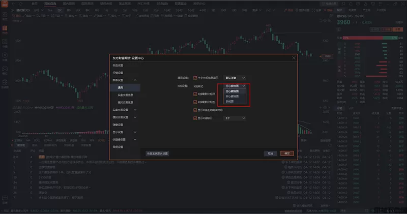 K线样式新增实心蜡烛图、折线图样式,您可根据需要在图表设置-通用中设置体验。
