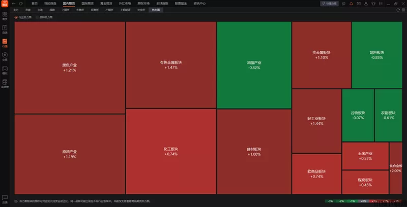 热力图板块面积与沉淀资金数额成正比,沉淀资金数额越大,则对应板块的面积越大。板块颜色与对应的涨跌幅相关,涨跌幅度越大,则对应板块的颜色越深,具体颜色与涨跌幅的对应关系可通过热力图右下角的颜色标尺查看。