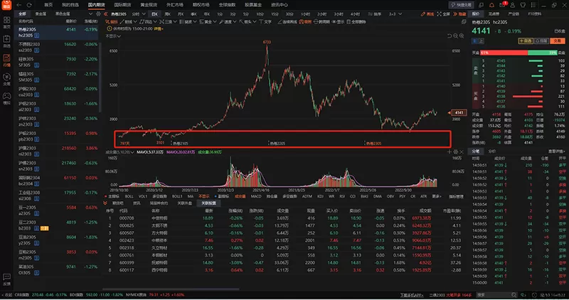PC端新增历史同月行情,支持查看国内期货日K周期下的历史同月数据。您可通过拖移K线或缩小K线查看所选合约的历史同月数据,行情图主图左下角天数为当前界面内的K线根数,主图底部展示合约标签,最新合约标签为橙色,历史同月合约标签为灰色,鼠标在行情图上移动时,主图底部会有标签提示当前合约名称,查看更便捷。