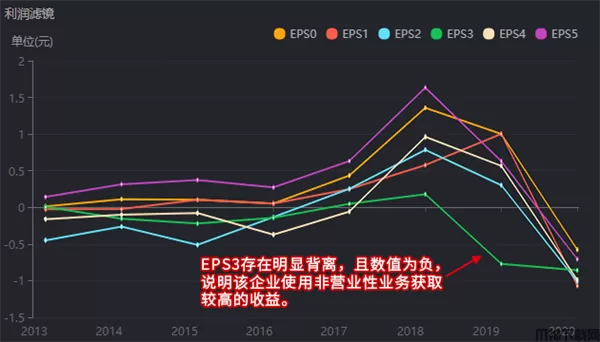 利润滤镜提供的EPS数据叠加图表,可通过分析各曲线的趋势、间距、背离等情况,直观展现企业各年份披露的净利润是否存在水分。