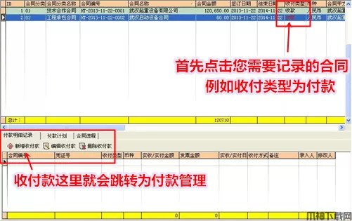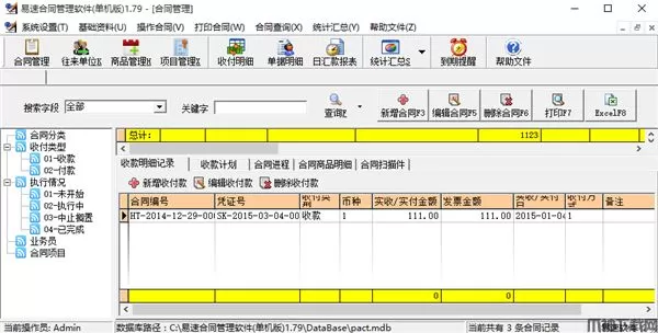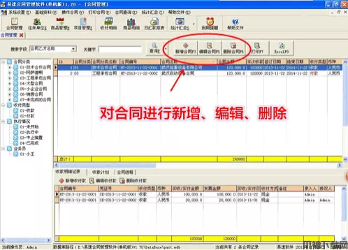 其中,[新增]和[复制]都表示新增合同,[复制]的功能是当要新增的合同与已有合同的主要资料相同时,将已有合同的主要资料复制过来,减少合同填写时间,[编辑]的功能是根据需要对已有合同进行修改,[删除]的功能是删除过时无用的合同及其收付款记录。